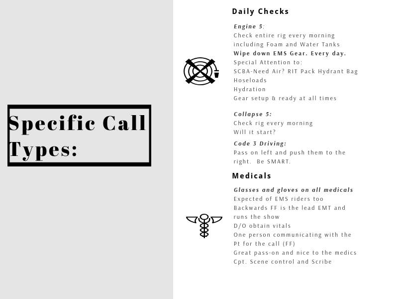 Then, as a crew, we have a quick stand up conversation at the tailboard to go over minor consistency of information on high hazard buildings, when and how we’re going to stretch longer than pre-connect attack lines, etc and to answer any questions the crew might have and we’re setup for a solid shift. We cannot expect any of our crew members to know what the expectations are if we don’t clearly and consistently communicate them. Here is an example of 2 of the pages including some specific call types. You can click on the image to expand it.